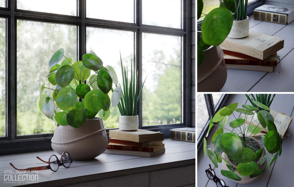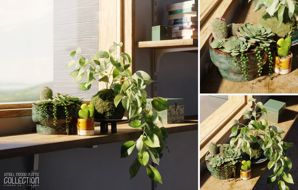 This is a set of 4 fully textured small indoor plant scenes, perfect for wide and close-up shots, ready to render with Cinema 4D 2024 and Corona 12.