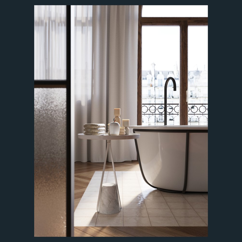 This is a fully textured interior bathroom scene that beautifully combines classic elegance with modern design, creating an atmosphere filled with natural light and refined details.